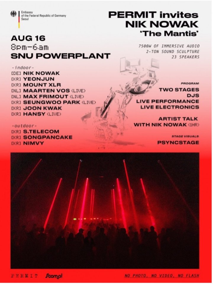 October 06th, 2025In August 2025, the Embassy of Germany in Seoul presented an innovative cultural program that transformed electronic music and sound art into a vehicle for diplomacy. Through the concept of “techno diplomacy,” the embassy highlighted Germany’s creative vitality while promoting dialogue between Europe and East Asia. The central event took place on August 16 at Seoul National University’s Power Plant, a former energy facility recently repurposed as a cultural venue under the SNU Institute for Culture and Arts. Organized in collaboration with local partners, the program featured Berlin-based sound artist Nik Nowak, who presented his monumental sound sculpture The Mantis.