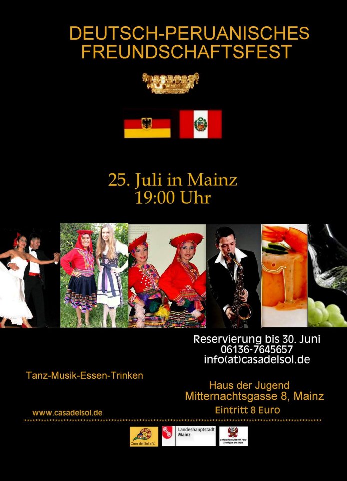 July 15th, 2015On July 25th, at 19.00 a cultural event will take place in Mainz at Casa del Sol, Haus der Jugend, an organization located at Mitternachtsgasse 8. This event will gather together the German and Peruvian communities in order to aid the integration of Peruvian immigrants into German Society, and is strongly supported by the Peruvian Embassy located in Berlin.